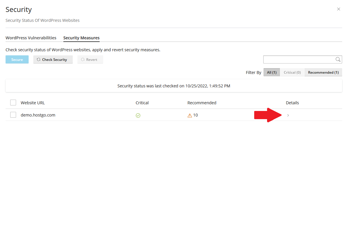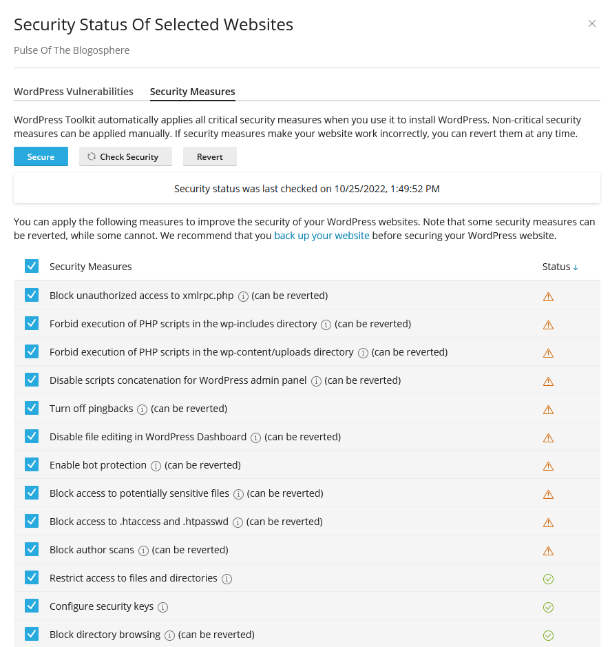 Here is the recommend changes to help secure WordPress. Put a check mark in the options you want and then click Secure